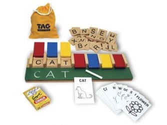 TAG's unique learning center provides a sure way to learn how to spell.. It consists of a spelling tray with an attached chalkboard, wood tiles with individual letters and spelling picture word cards. A word is spelled by copying the word card. Letter tiles are placed in the correct sequence in the spelling tray. The word is studied, then the doors are closed. The child writes out the word on the chalkboard from memory. Correctness is checked by lifting the doors and matching the letter tiles to the handwritten word. Checking answers by lifting the doors provides positive reinforcement when correct and negative reinforcement when incorrect. This is ideal for the teaching of spelling, especially when the child works alone and checks his or her own answers - mistakes then become a part of the learning process and are not perceived in a negative way.
